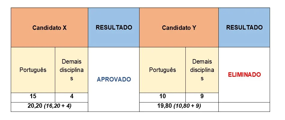Utilizando um exemplo hipotético, é possível entender o problema que afetou boa parte dos eliminados após a nova correção. Com maior peso na língua portuguesa, um candidato que tenha acertado 19 questões em conhecimentos básicos poderia alcançar o mínimo de 20 pontos para se classificar à próxima fase, enquanto que outro que teve maior aproveitamento em outras áreas seria desclassificado.